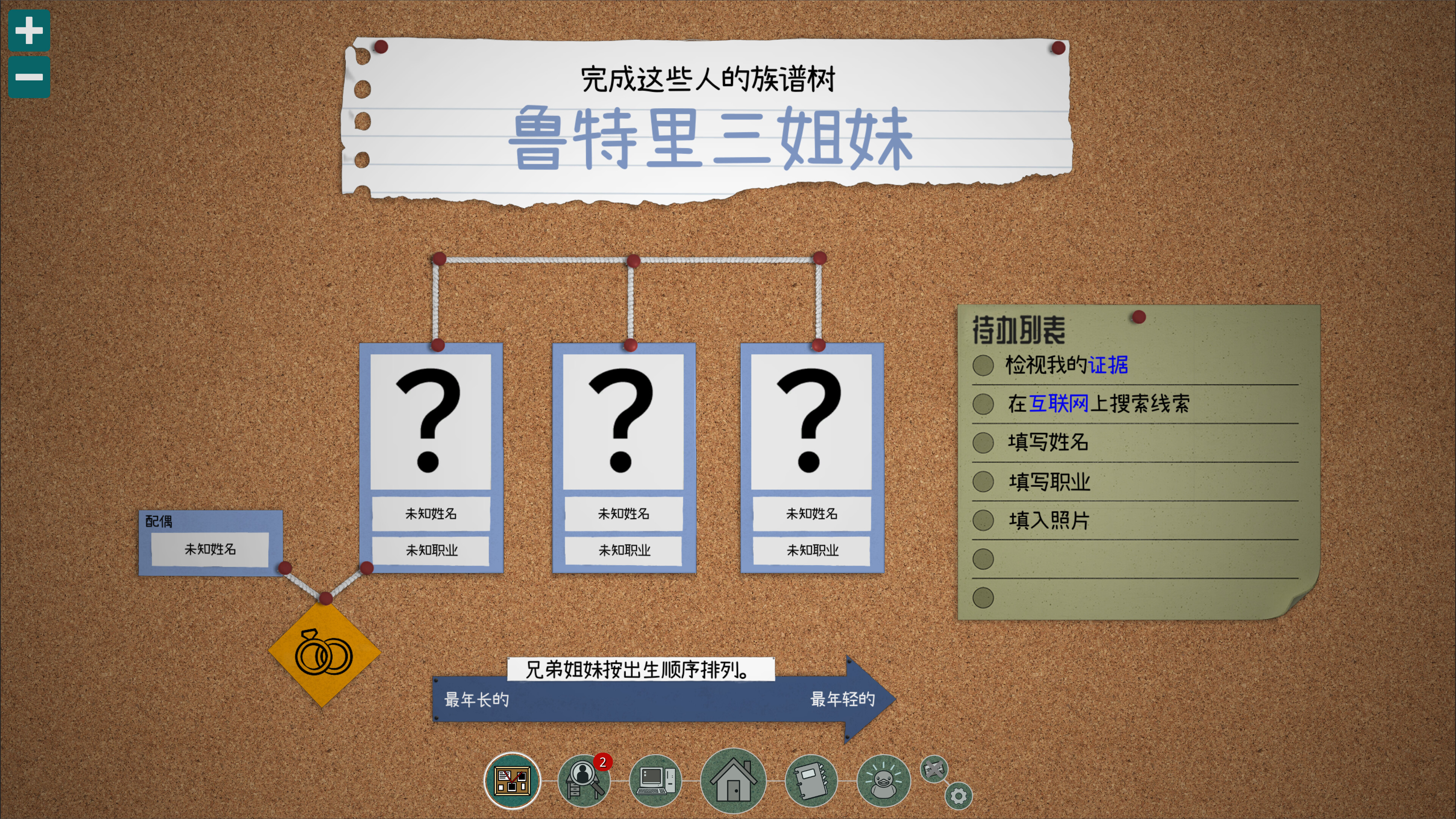 仅凭借你的强力工具——拨号调制解调器的力量,你将搜寻照片、书籍、文章和其他证据。然后根据发现的亲属关系进行关联推理。每在家族树上正确填入一个位置,你手中剩余的名字和照片可放置的位置就越少——但证据也会愈发难以寻找且会更加隐晦。